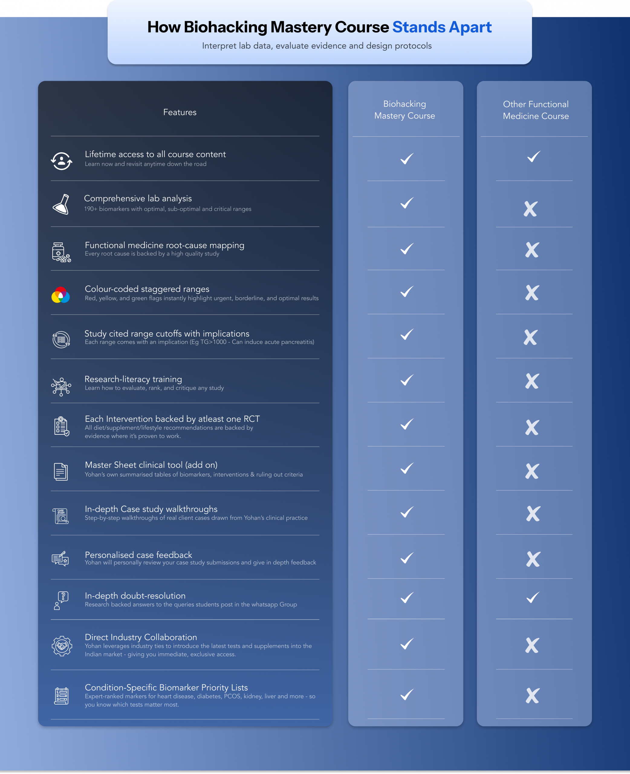 The Biohacking Mastery Course is a six-month, 115+ hour immersive program that empowers health professionals and serious wellness enthusiasts with evidence-based mastery, drawing on over 3,500 peer-reviewed studies and 5 years of Yohan’s clinical experience. It helps participants cut through misinformation, pinpoint the root causes of symptoms and chronic conditions, interpret biomarker ranges that transition from optimal through suboptimal to critical, and translate cutting-edge research into precise, personalised interventions. By the end of this journey, you will not only command the latest scientific insights but also possess the confidence and clarity to design and implement protocols that drive real-world health outcomes for your clients or yourself.